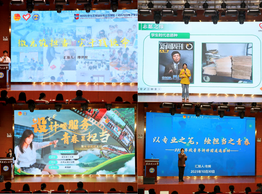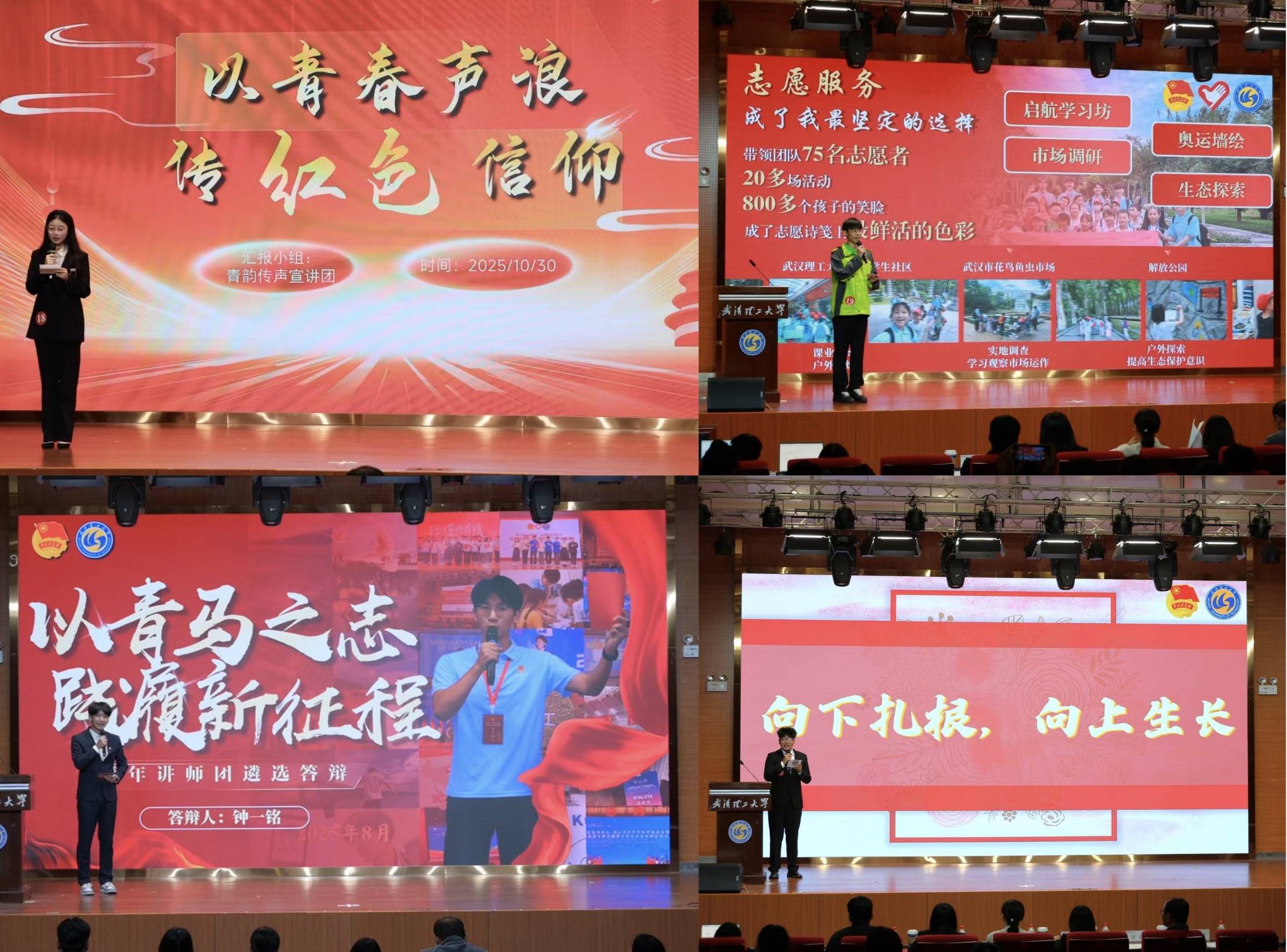 10月30日晚,武汉理工大学2025-2026年度“青年讲师团”遴选暨示范宣讲活动顺利举行。20位青年学子和团队围绕科技创新、乡村振兴、绿色发展、社会服务、卫国戍边等各领域,用生动鲜活的语言将党的创新理论与自身成长奋斗故事相融合,让青言青语“声声入理”。