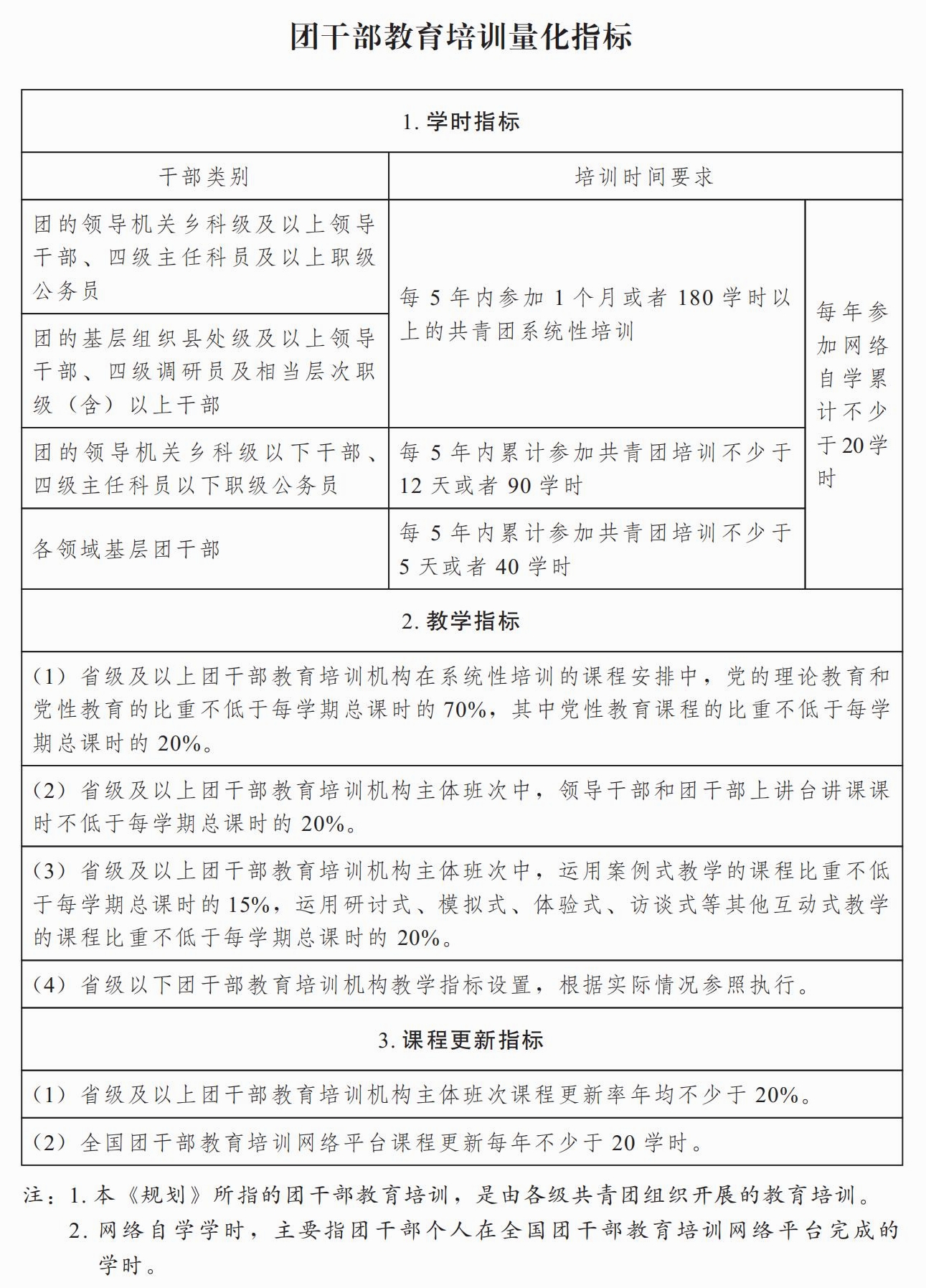 (二)主要目标。党的创新理论武装更加系统深入,用习近平新时代中国特色社会主义思想凝心铸魂取得显著成效,广大团干部理论素养不断增强,理想信念更加坚定、思想意志更加统一、行动步调更加一致,对党的创新理论更加笃信笃行,用以指导实践、推动工作更加自觉。政治训练更加扎实有效,广大团干部政治能力不断增强,党性更加坚强,作风更加过硬,政治判断力、政治领悟力、政治执行力不断提高,政治纪律和政治规矩意识进一步增强,自觉在政治立场、政治方向、政治原则、政治道路上同以习近平同志为核心的党中央保持高度一致。履职能力培训更加精准管用,广大团干部服务青年的群众工作本领不断增强,贯彻新发展理念、构建新发展格局、推动高质量发展能力进一步提高,统筹发展和安全的能力不断提升,为党做好青年工作的专业能力不断增强,团结动员广大团员青年积极投身中国式现代化建设的实战能力进一步提高,专业知识和人文综合素养更加完备。团干部教育培训体系更加科学健全,培训内容更具时代性系统性,培训方法更具针对性有效性,培训保障更加坚实有力,培训制度更加规范完备,选育管用机制更加协同高效。