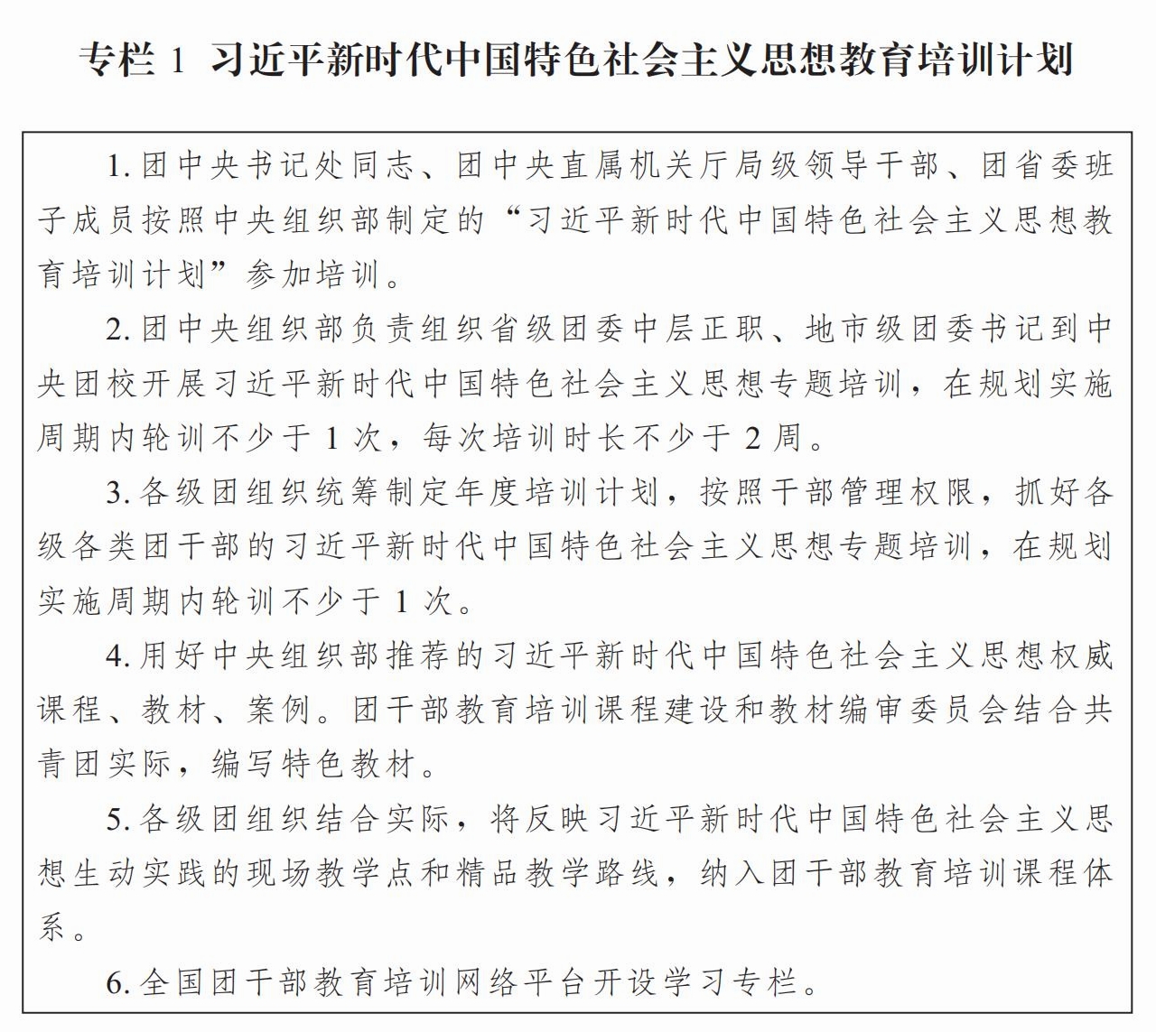 (一)聚焦聚力,久久为功。完善团干部理论教育培训长效机制,落实党的创新理论学习教育计划,组织实施习近平新时代中国特色社会主义思想教育培训计划(专栏1),系统谋划、持续用力,不断把思想铸魂、理论武装工作引向深入。坚持把习近平新时代中国特色社会主义思想作为团的各级领导机关班子成员理论学习中心组学习首要内容,作出具体安排、精心组织实施;作为各级团干部教育培训机构的主课必修课,办好理论进修班、理论研修班;作为团干部学习的中心内容,全面系统学、持续深入学、联系实际学。以县处级及以上团干部为重点,开展习近平新时代中国特色社会主义思想和党的二十大精神集中轮训;深入开展主题教育,通过专题学习、研讨交流、主题党课、调查研究、建章立制等形式,推动党的创新理论学习教育走深走实走心,使广大团干部更加深刻领悟“两个确立”的决定性意义,更加自觉增强“四个意识”、坚定“四个自信”、做到“两个维护”。深入开展习近平总书记关于青年工作的重要思想学习培训,使广大团干部学习掌握党的青年工作的地位作用、目标任务、职责使命、实践要求,为做好新时代新征程党的青年工作打牢思想基础。