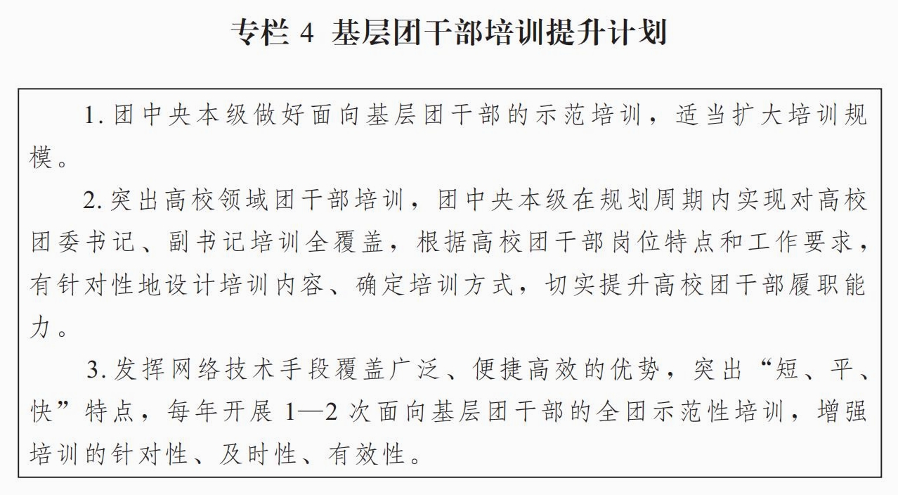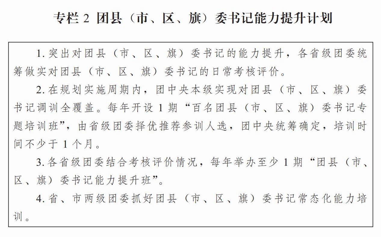 (二)突出“关键少数”政治训练。坚持把政治训练贯穿团干部成长全周期,使团干部的政治素养、政治能力与担负的领导职责相匹配。强化“一把手”政治培训,有计划地选调团的各级领导机关主要负责同志到团干部教育培训机构参加专题培训。强化对团县(市、区、旗)委书记这一群体的培训,实施团县(市、区、旗)委书记能力提升计划(专栏2)。突出对团的领导机关干部的政治训练,各级团的领导机关加强对机关干部的常态化政治能力培训。加强对青年人才的政治引领,团中央组织部会同有关单位每年组织一定数量青年人才开展国情研修。积极推动将地方团的领导机关班子成员培训纳入地方党委组织开展的干部政治理论培训范畴。
