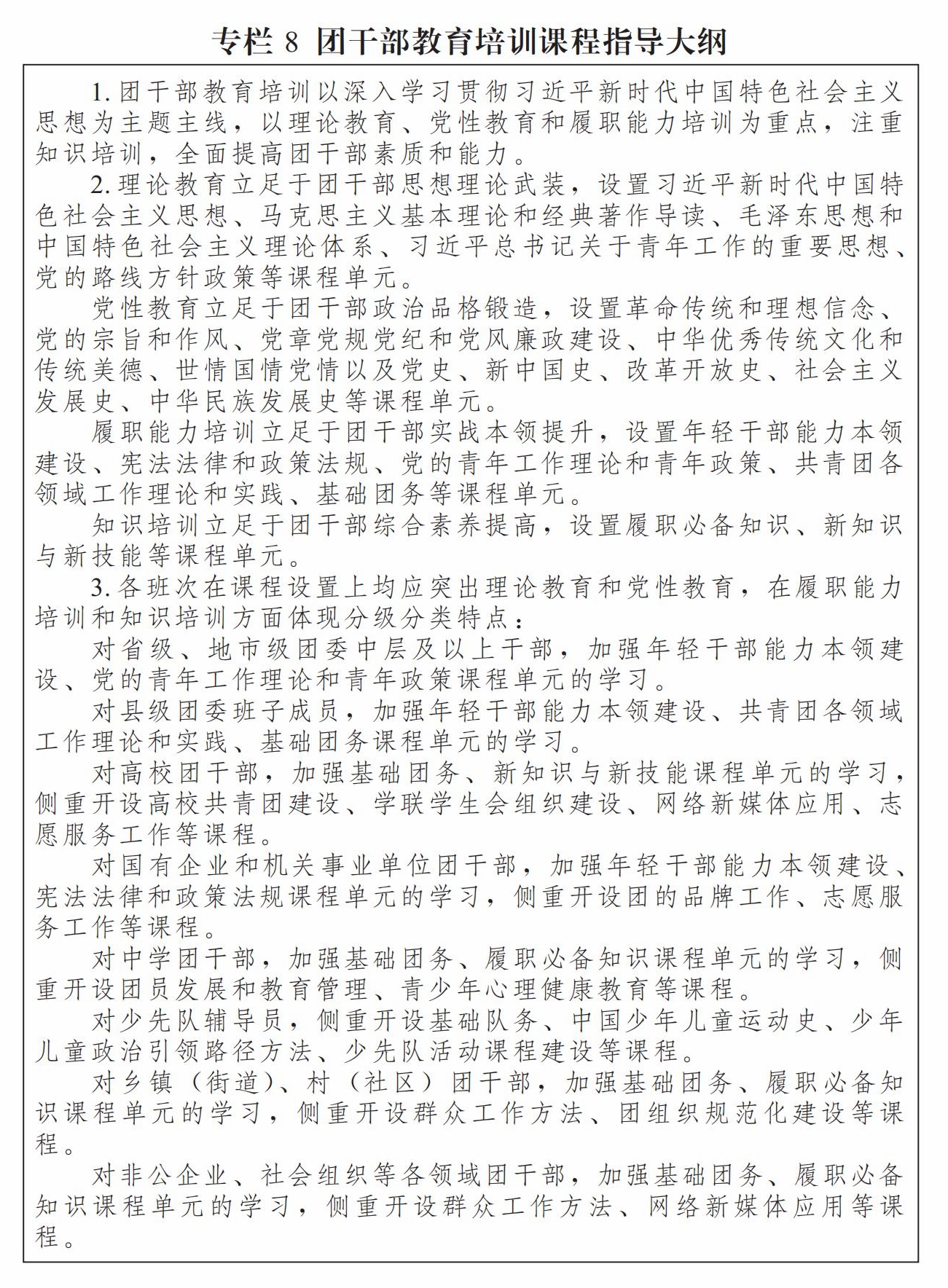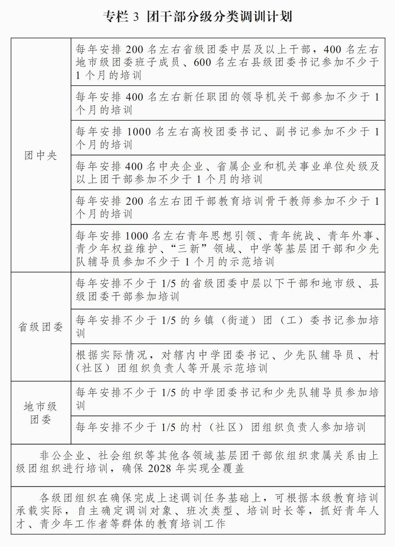 (二)坚持分级分类。根据各级团的领导机关干部、高校团干部、国有企业和机关事业单位团干部、中学团干部、乡镇(街道)团(工)委书记、村(社区)团组织负责人、非公企业、社会组织等其他各领域基层团干部的不同对象特点,把团干部履职能力培训的普遍性要求与不同类别、不同层级、不同岗位团干部的特殊需要结合起来,整合优质资源,加强团干部教育培训机构与党校(行政学院)、干部学院、党性教育基地等的合作联动,多渠道多方面开展履职能力培训,切实增强教育培训的时代性、系统性、针对性、有效性。发挥中央团校、全国青少年井冈山革命传统教育基地主体作用,围绕党的中心任务、党中央重大决策部署和国家重大战略需求开展专题培训;发挥全国团干部教育培训基地优势,开展政策解读、重点任务落实等专题培训;发挥地方团干部教育培训机构优势,开展基层团干部实务培训;发挥全国团干部教育培训网络平台作用,抓好履职通识培训;加强与派出单位、接收单位的协作,抓好援派帮扶干部人才、挂职干部等教育培训。积极创造条件,支持干部在职自学。实施团干部分级分类调训计划(专栏3)。