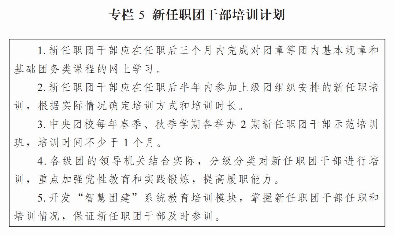 (三)突出实战实效。强化基层导向,把准培训需求,加强培训设计,选优配强师资,综合运用多种方式方法开展实战化培训,实施基层团干部培训提升计划(专栏4)。坚持“干而论道”,注重邀请领导干部、专家学者、基层团干部、先进青年典型等授课,让懂政策的人讲政策、有经验的人谈经验、会方法的人教方法。团的领导机关要加强对边疆地区、乡村振兴重点帮扶地区团干部教育培训支持力度。强化专业导向,针对青年思想引领、青年统战、青年外事、青少年权益维护、“三新”领域、中学等类别团干部和少先队辅导员开展专题培训,紧贴业务实操,加大案例教学比重,把实践中鲜活生动的案例及时运用到教育培训中。运用情景模拟、桌面推演、工作复盘等方法,让团干部在仿真情境中学习如何处理问题、化解矛盾、防范风险。探索把课堂搬到基层一线和普通青年中去,让团干部在实践中学习掌握开展调查研究、密切联系青年、做好群众工作的方式方法,提升解决实际问题的能力本领。加强案例开发和实训室建设。实施新任职团干部培训计划(专栏5)。