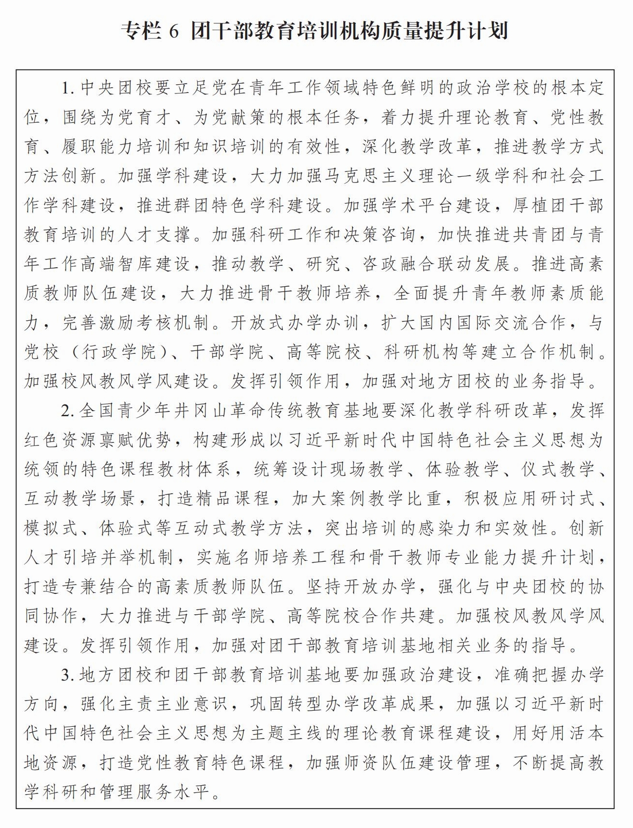 (一)培训机构建设。加强团干部教育培训机构规范管理和质量提升,推进各级团校、团干部教育培训基地建设,构建以中央团校、全国青少年井冈山革命传统教育基地为龙头,各级团校、团干部教育培训基地相互补充、布局合理、规范有序的培训机构体系,强化中央团校对地方团校的业务指导,不断提高办学水平。加强各类团干部教育培训机构规范管理,开展团干部教育培训机构办学质量评估。支持各地各级团组织联合开展培训,鼓励团干部教育培训机构开展区域协作交流,推动优质培训资源共建共享。实施团干部教育培训机构质量提升计划(专栏6)。