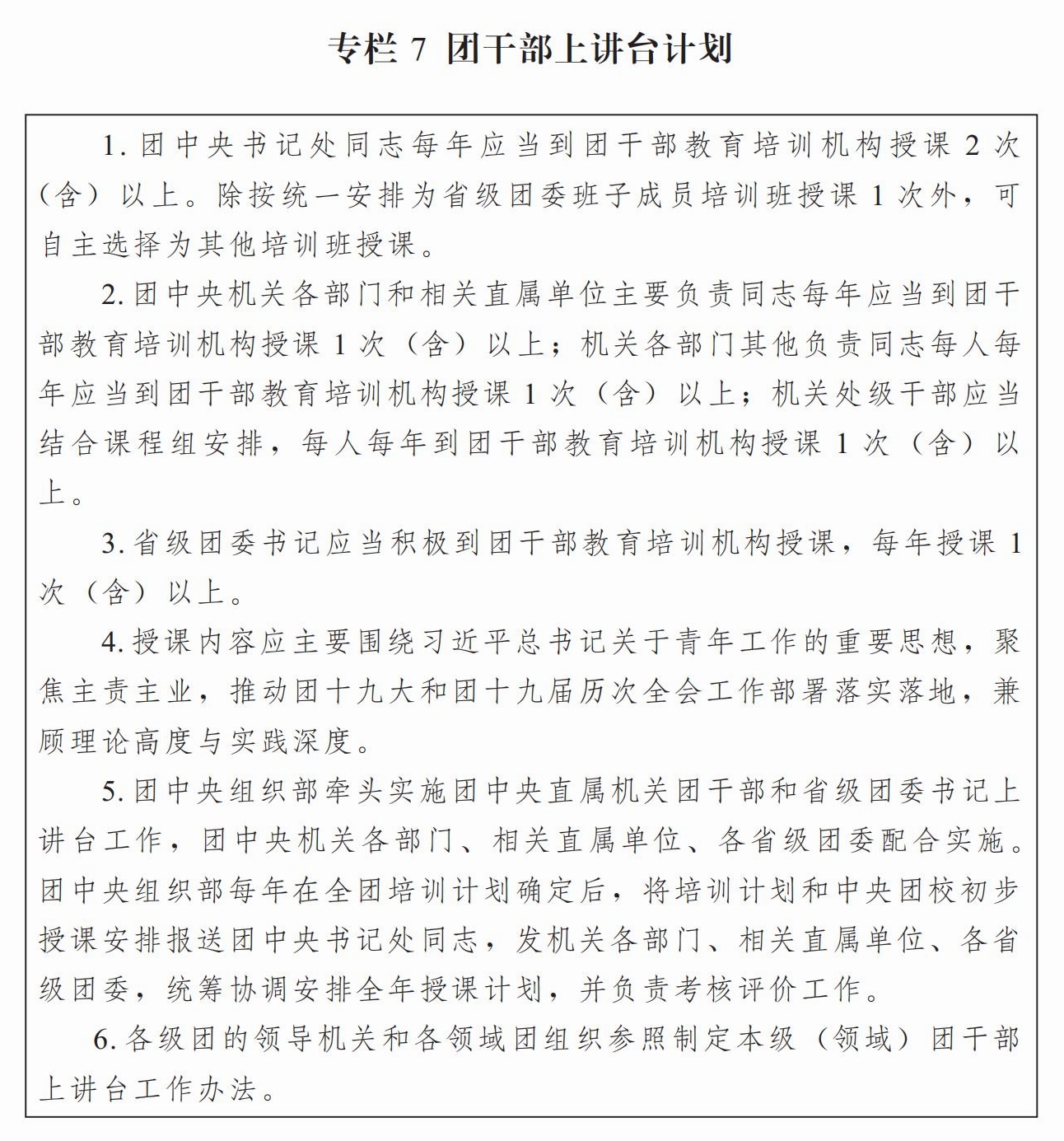 (二)师资队伍建设。加大名师培养引进力度,把团干部教育培训师资纳入各级青年人才政策支持范畴,努力造就一批对党忠诚、精通党的创新理论、授课水平高、在学科领域有影响力的知名教师。加强师资队伍党性教育和业务培训,完善专职教师通过列席会议、基层调研、挂职锻炼等方式促进知识更新、加深理论研究。通过“名师带徒”等方式,加强中青年骨干教师培养。大力推进团干部上讲台,实施团干部上讲台计划(专栏7)。注重在领导干部、先进青年典型、优秀基层团干部中遴选培养师资。分级建设师资库。探索建立符合团干部教育培训特点的师资队伍考核评价体系。