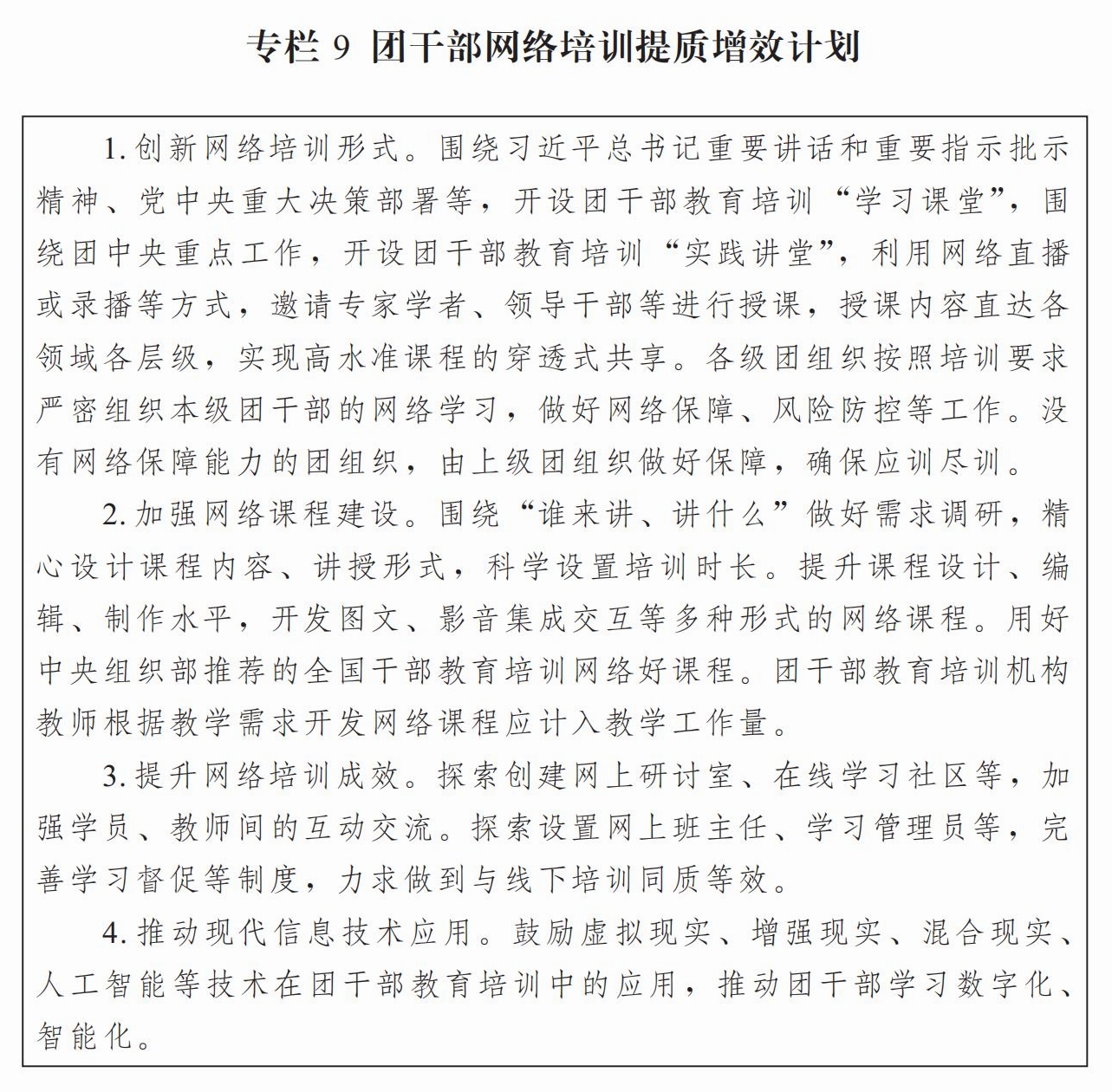 (二)加强网络培训课程建设。鼓励团干部教育培训机构开发精品网络课程。注重把握网络教学特点和规律,改进授课方式,提高制作水平,丰富呈现形式,提升课程质量。严把网络课程政治关、质量关,规范讲授、制作、审核、发布和更新、退出流程。充分发挥网络培训优势,推动优质资源下基层。用好网络直播培训形式,增强现场体验感。实施团干部网络培训提质增效计划(专栏9)。