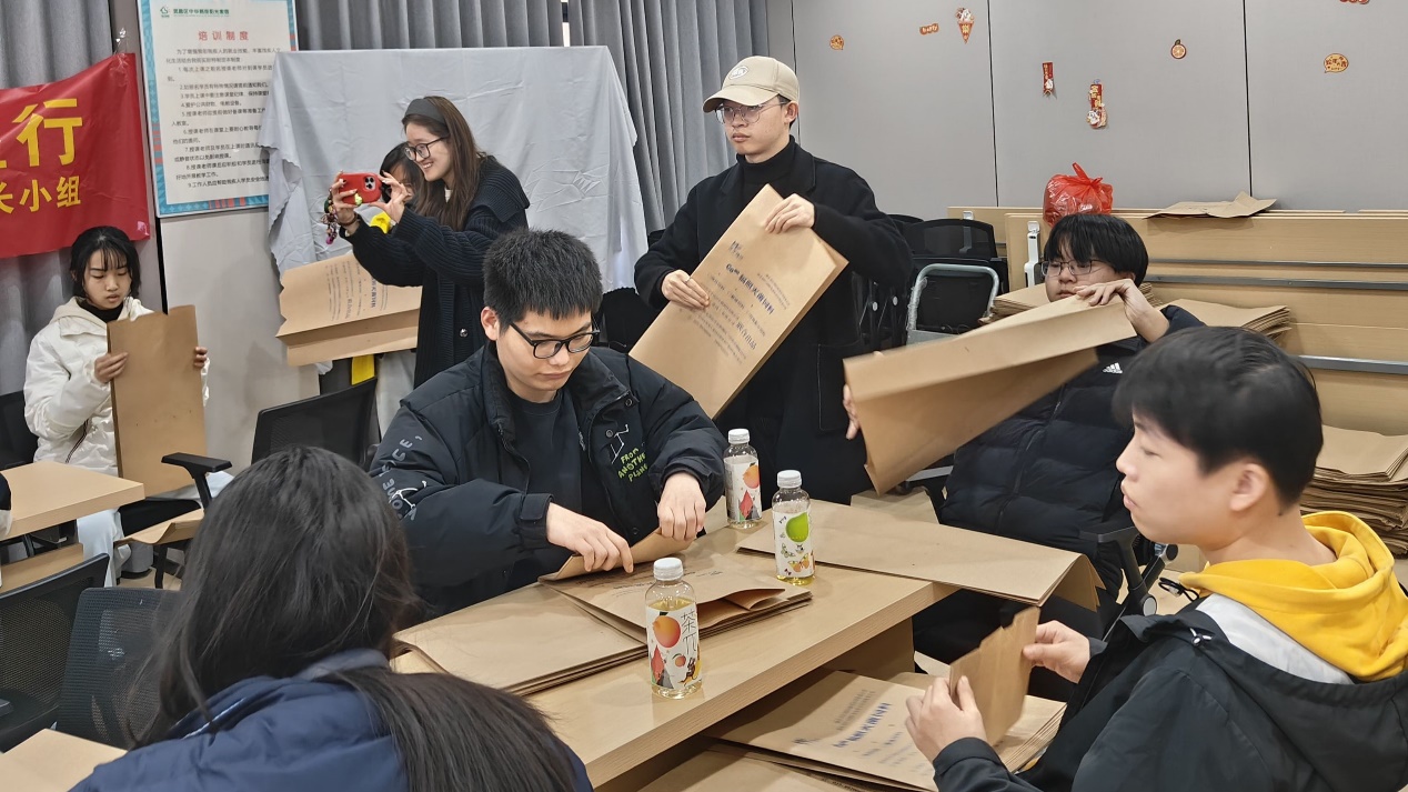 培训结束,同学们迅速投身到叠纸袋的工作中。对于手部行动不便的残疾人,叠纸袋并非易事,可他们始终坚守。同学们积极协作,有人负责将纸张分类整理,方便取用;有人专注折叠,凭借熟练技巧,让纸张快速成形;还有人在旁递拿材料,保障流程顺畅。在大家的默契配合下,叠好的纸袋在桌面上不断堆积。完成几百只纸袋制作后,几位同学主动承担打包任务,将纸袋有序码放、妥善捆绑。残疾人朋友看着齐心协力完成的成果,眼中满是认可与感激。