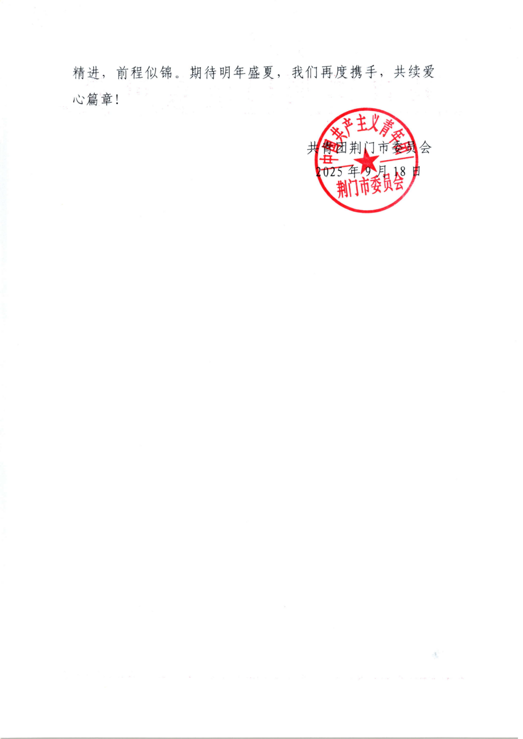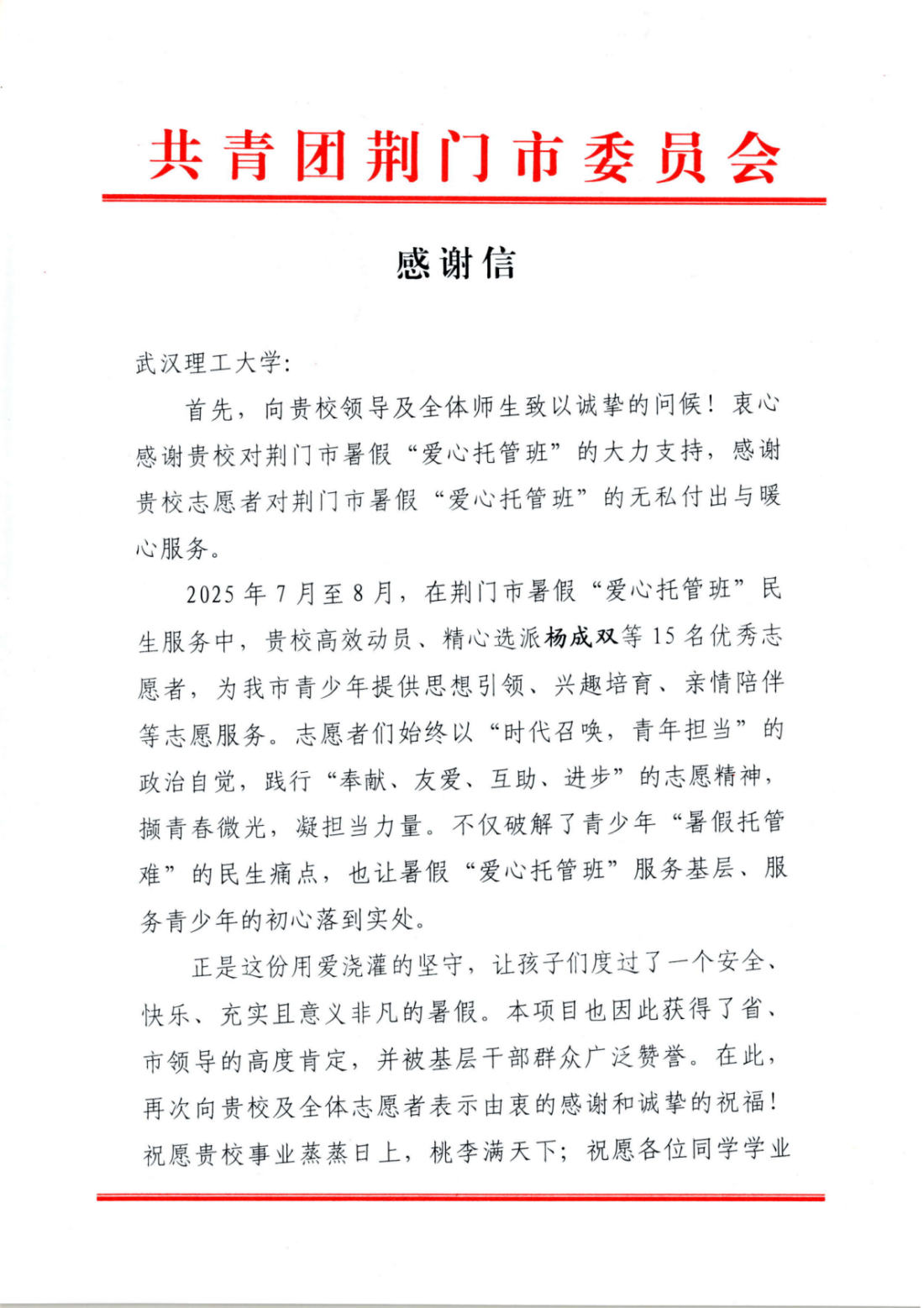9月18日,武汉理工大学郎坤志愿服务队组建的“红润童心 青春笃行”暑期社会实践队的队员们收到了来自共青团荆门市委的一封感谢信,信中肯定了队员们的奉献付出,并对其表达了高度赞扬。