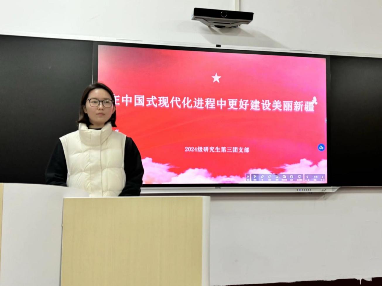 为扎实推进中国式现代化新疆实践、实现新疆社会稳定和长治久安总目标,马克思主义学院2024级研究生第三团支部于10月21日下午在弘毅楼301教室成功举办了“在中国式现代化进程中更好建设美丽新疆”主题团日活动。本次活动由团支部书记郝慧敏主持,支部成员梅佳雪主讲,全体团员积极参与。