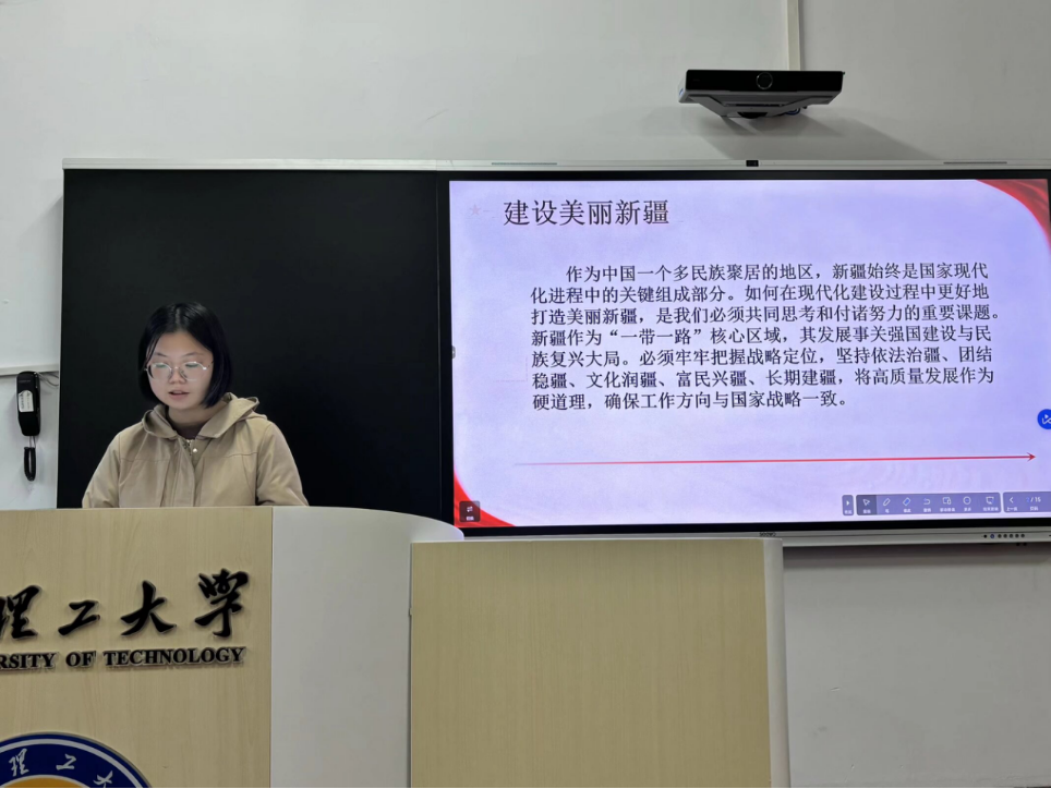 随后,梅佳雪同学围绕“在中国式现代化进程中更好建设美丽新疆”做主题分享。她系统讲解了《新时代党的治疆方略的成功实践》白皮书的重要内容,带领全体团员认真学习建设社会主义现代化新疆的背景、主要内容和重要成果,指出新时代新征程,完整准确全面贯彻新时代党的治疆方略,就要牢牢把握新疆在国家全局中的战略定位,扭住社会稳定和长治久安的工作总目标,以铸牢中华民族共同体意识为主线,把依法治疆、团结稳疆、文化润疆、富民兴疆、长期建疆各项工作做深做细做实。