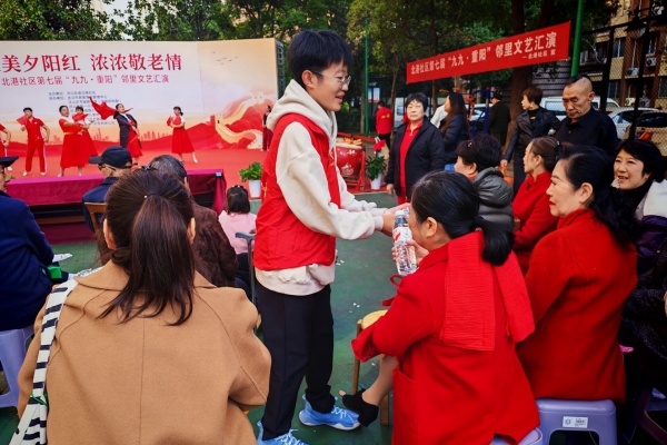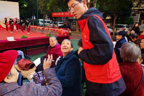 演出正式开始后,志愿者们分散在各个区域维持秩序,耐心引导老人入座,帮助摆放小朋友们的背包并和老师们一起管理小朋友们的秩序,用细致周到的服务传递温暖。其间,社区工作人员临时需要离开一会,志愿者们也迅速补位,帮助社区工作人员分担压力。整场演出节奏流畅,节目精彩纷呈,掌声不断。在维持秩序的同时,志愿者们还承担了摄影工作,用镜头记录精彩瞬间,为社区留下了宝贵的影像资料。在演出结束后,志愿者们又迅速投入收尾工作,清理场地、归还物资,待一切妥当后和社区全体工作人员拍了张大合照,庆祝本次重阳节文艺汇演圆满结束。
