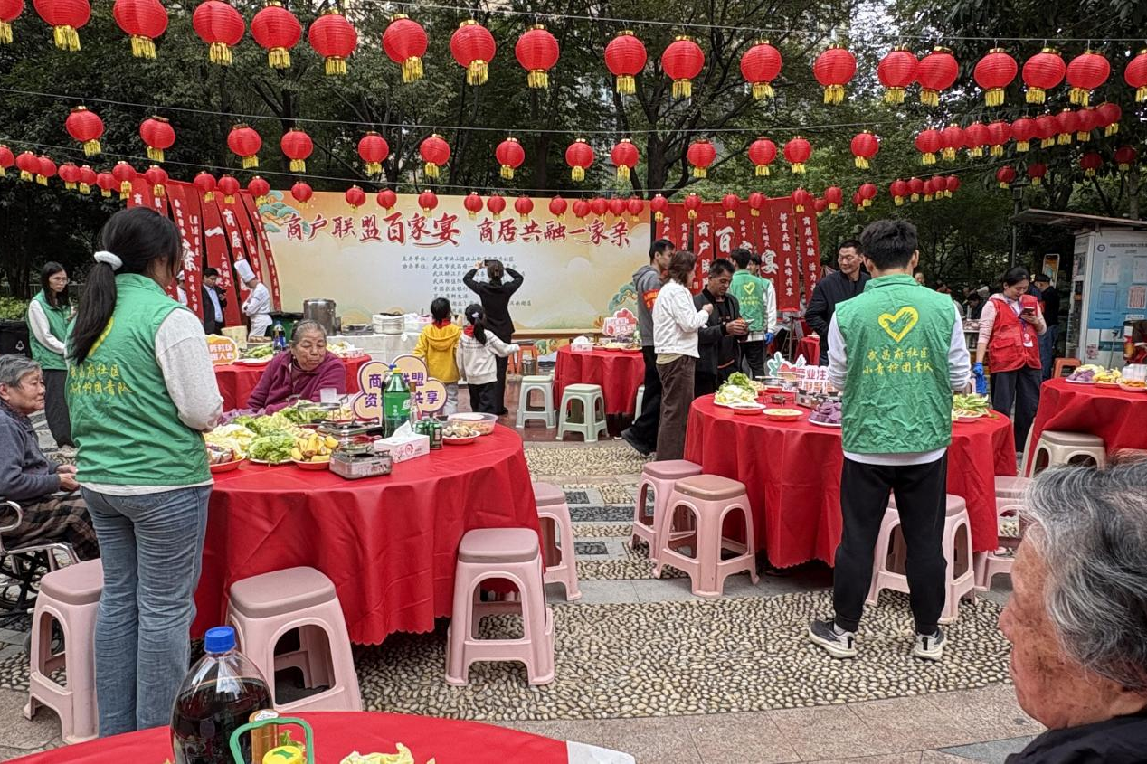 宴席过程中,志愿者引导宾客入场,悉心为老人和小孩安排座位,同时每张桌子安排一位志愿者负责维护秩序,其他志愿者穿梭在各桌之间,及时向社区负责人反馈问题,及时提供服务,确保菜品的供应。志愿者用热情服务保障了百家宴的温馨与有序,整个宴席充满了欢声笑语,传递社区温情,促进构建和谐社会。