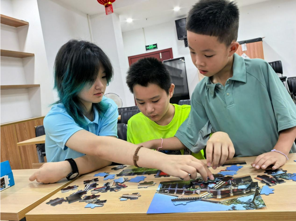 红色故事忆峥嵘,初心传承少年智。在红色教育课堂上,实践队员们讲述了革命先烈的英勇事迹,介绍了南湖红船、遵义会议等历史事件,让孩子们感受党的发展历程,感受革命精神。特别设计的“红色拼图挑战赛”中,孩子们分组合作,将印有红船、遵义会议会址等历史场景的拼图碎片组合完整。拼图完成后,实践队员们还播放了红色影片,让孩子们在光影中感受革命精神的传承。