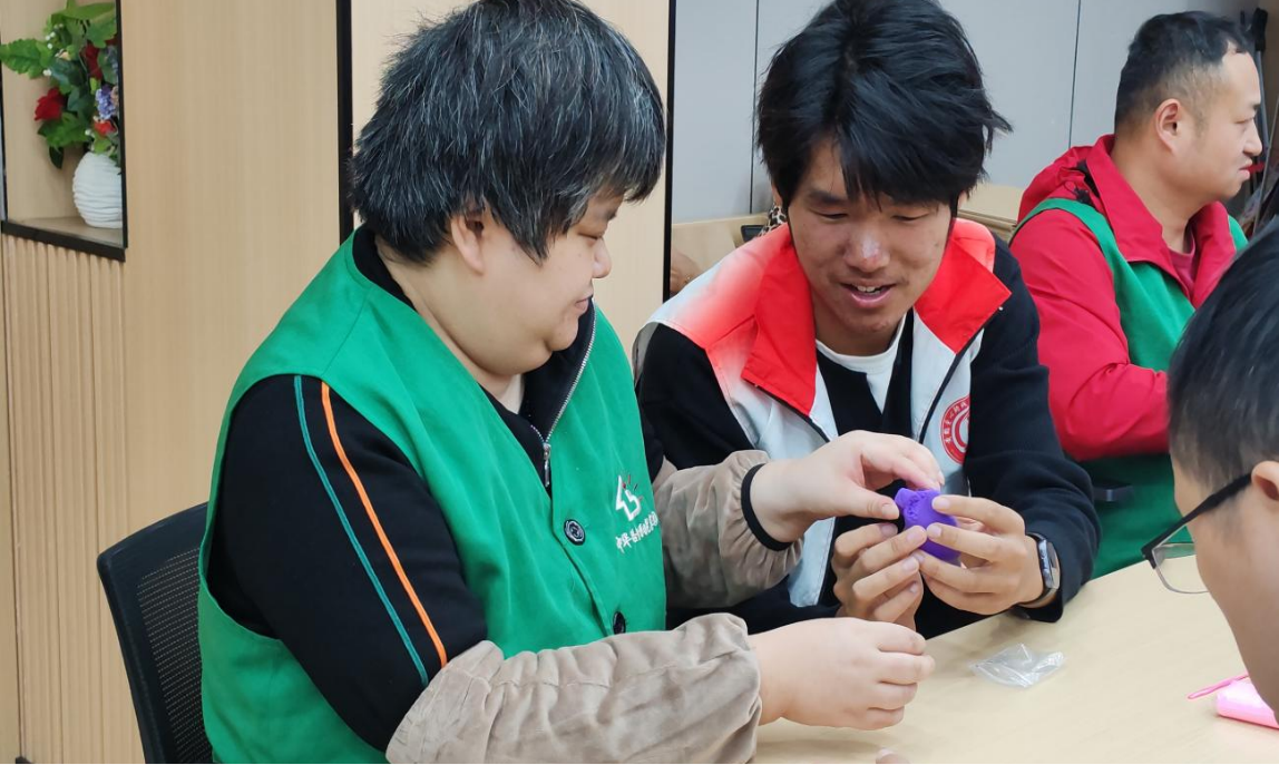 活动当日,阳光家园内气氛温馨而活跃。志愿者们带来了五颜六色的超轻黏土,并为学员们精心播放了超轻黏土制作的基础教程视频。视频以生动直观的方式,展示了如何运用揉、捏、搓、按等手法,将五彩斑斓的黏土变成各种可爱的造型,迅速激发了学员们的浓厚兴趣与创作热情。