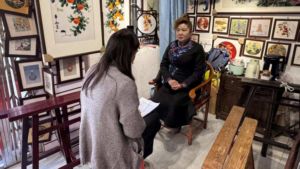 活动伊始,沈昌慧老师带领同学们参观艺社内陈列的汉绣作品,细致讲解双面绣、掺针等经典绣法的技艺要点。随后,沈老师系统介绍了汉绣的发展历程,深入剖析不同绣法在作品呈现上的差异、优势及艺术特色。参观尾声,支部代表胡浚颖同学对沈昌慧老师进行专访,沈老师分享了自己与汉绣的结缘故事、从事汉绣工作的初心及对汉绣文化的深刻认知。当被问及大学生参与汉绣传承的建议时,沈老师表示,希望同学们利用课余时间学习、制作汉绣,在动手实践中培育兴趣,争做汉绣文化新时代的传承者与爱好者。