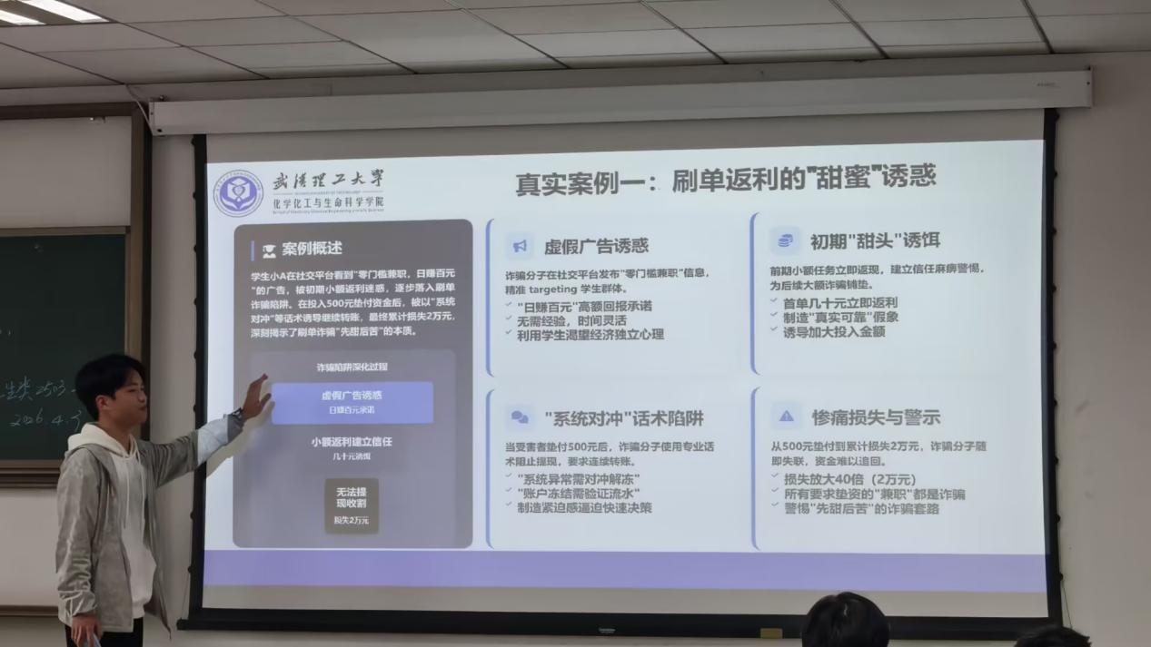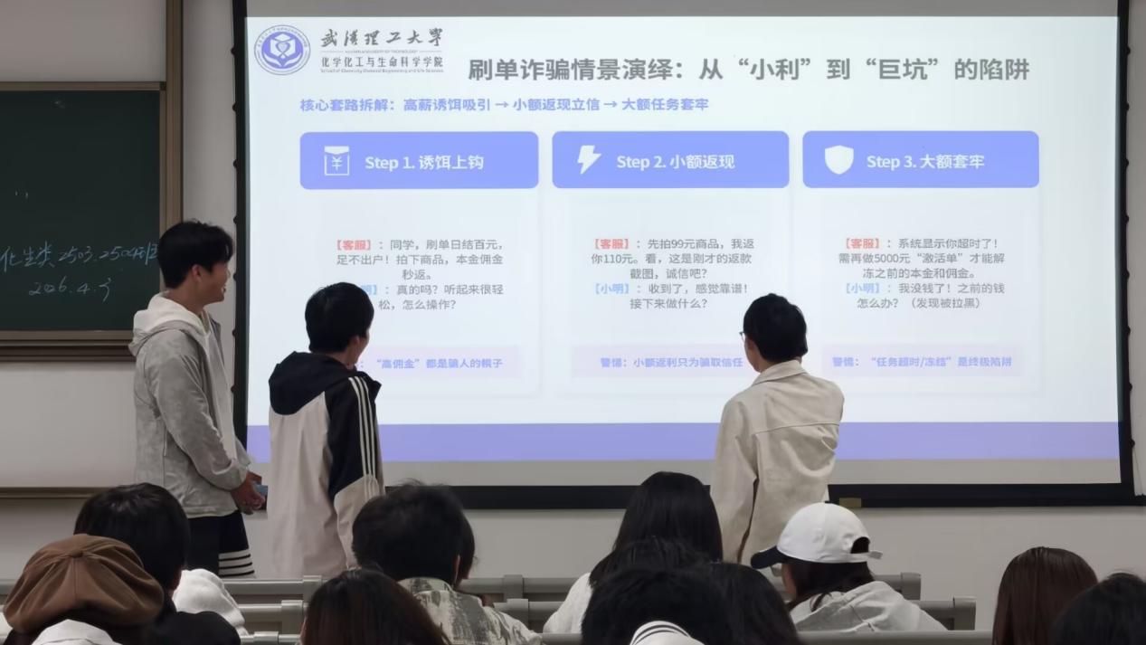 活动还设置了情景演绎环节。同学们现场还原刷单诈骗全过程:从“日结百元”的诱饵,到小额返现的“甜头”,再到“系统冻结需解冻”的终极陷阱——每一步都让在场同学感同身受。有同学感慨:“以前觉得诈骗离自己很远,没想到话术就藏在‘免费领’和‘低价购’里,稍不留神就会中招。”