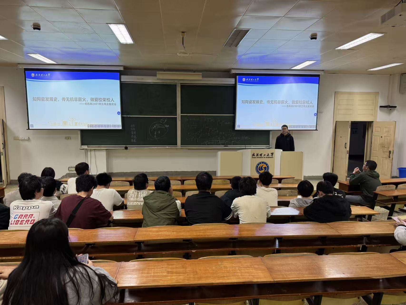 为深化专业认知、传承学科精神、厚植爱校荣校情怀,4月12日晚,武汉理工大学无机非金属材料工程2401班在鉴三教学楼202教室成功召开“知陶瓷发展史,传无机非薪火,做爱校荣校人”主题班会。班级全体同学参与本次活动,共同探寻陶瓷文化脉络,感悟无机非专业使命,凝聚荣校报国初心。