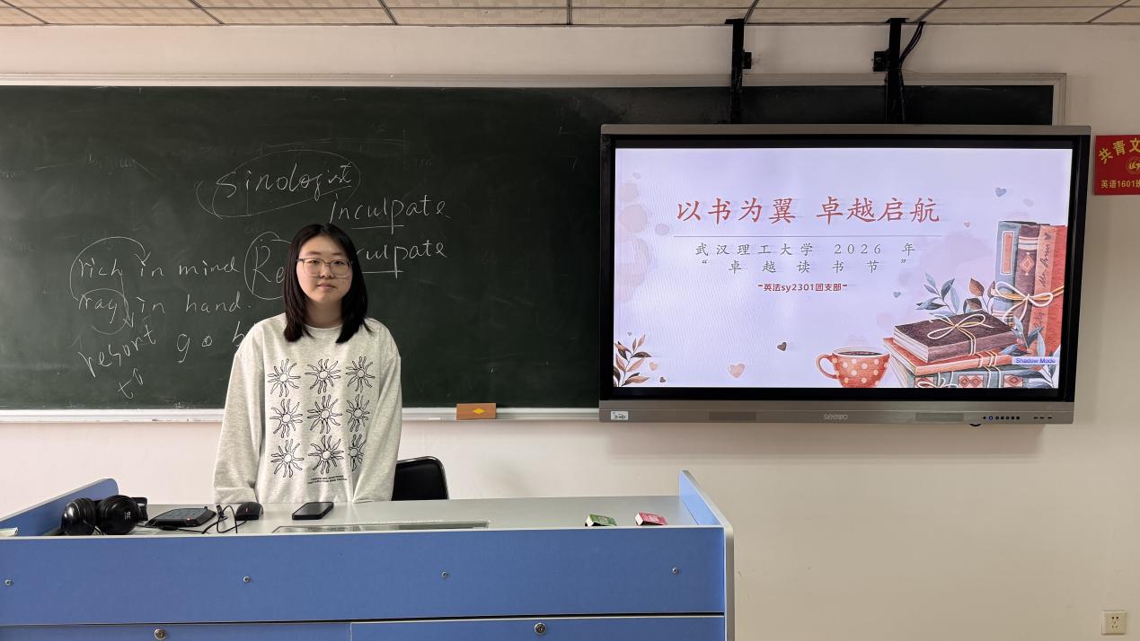 为积极响应学校“以书为翼 卓越启航”卓越读书节号召,紧扣第31个世界读书日与《全民阅读促进条例》实施要求,落实校团委四月主题团日活动部署,4月16日,英法sy2301班全体团员齐聚学海楼1201教室,开展四月主题团日活动。本次活动摒弃形式化流程,立足英法专业特色与青年阅读需求,通过共读一刻钟、好书分享、主题研讨、阅读计划制定四大环节,让阅读走进团员日常,以书香浸润青春成长,用文字力量点亮卓越之路。