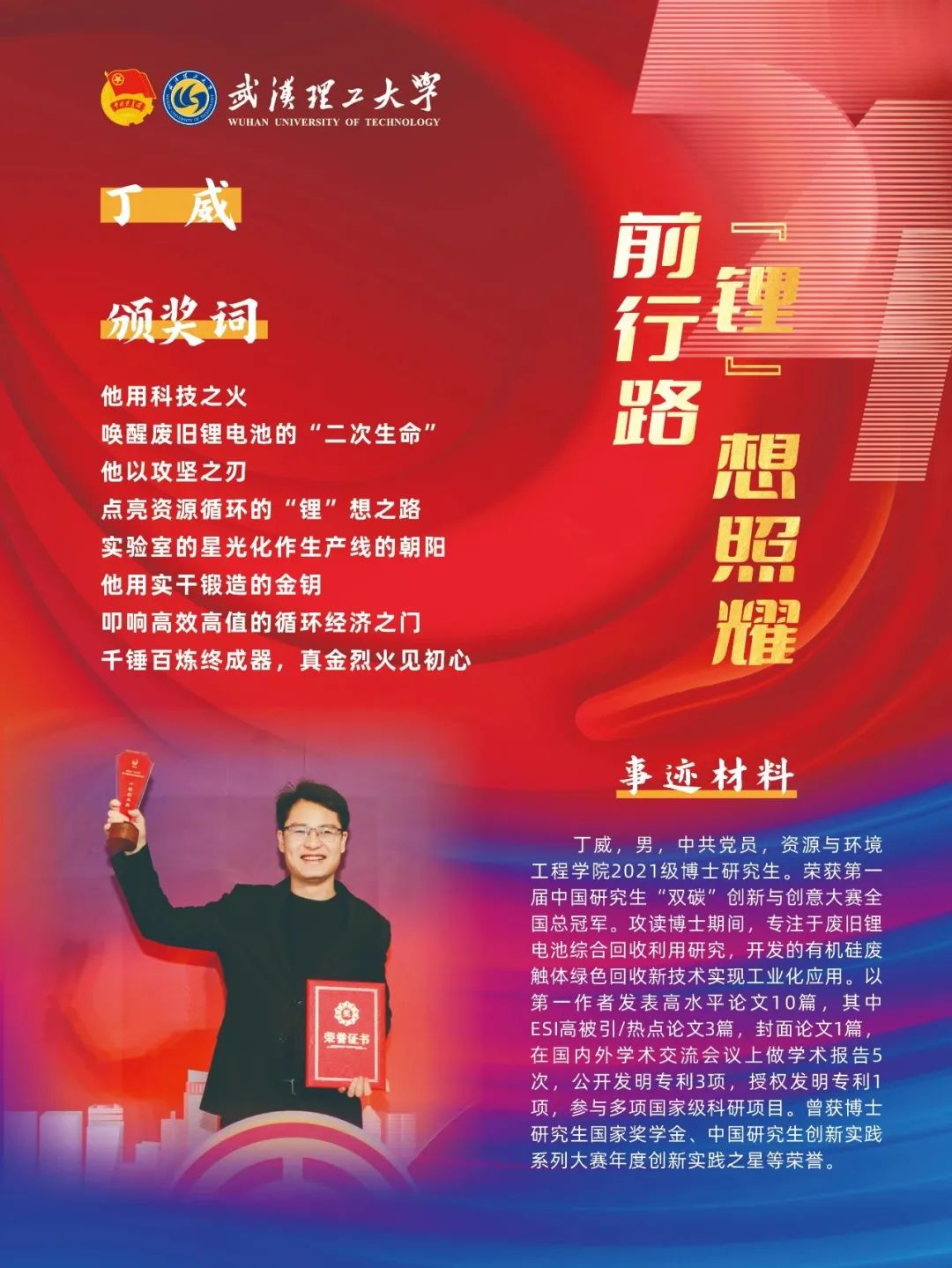 丁威,男,中共党员,资源与环境工程学院2021级博士研究生。荣获第一届中国研究生“双碳”创新与创意大赛全国总冠军。攻读博士期间,专注于废旧锂电池综合回收利用研究,开发的有机硅废触体绿色回收新技术实现工业化应用。以第一作者发表高水平论文10篇,其中ESI高被引/热点论文3篇,封面论文1篇,在国内外学术交流会议做学术报告5次,公开发明专利3项,授权发明专利1项,参与多项国家级科研项目。曾获博士研究生国家奖学金、中国研究生创新实践系列大赛年度创新实践之星等荣誉。
