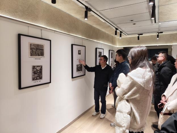 随后,师生共同参观了正在展出的“抗战主题版画展”。一幅幅黑白鲜明、刀法遒劲的版画作品,以强烈的视觉冲击力和历史厚重感,再现了中华民族艰苦卓绝的抗战历程。现场讲解从艺术技法、历史背景与情感表达等多角度展开,将艺术赏析与爱国主义教育紧密结合。师生驻足观看、细心品味,在线条与历史的交织中深切感受到艺术作品强大的感染力与社会意义,对“艺术为人民”的理念有了更直观的理解。