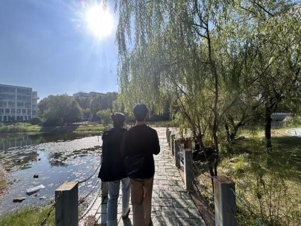 活动伊始,主持人周何慧子播放了盲人摄影师李娜的访谈片段,阐释了“用非视觉视角发现世界”理念,并介绍了活动规则。参与者分为“摄影师”和“引导员”两类角色。摄影师戴上眼罩,模拟视障状态进行拍摄;引导员则负责路线规划、拍摄辅助与安全保障。随后,各小组按不同路线在校园中展开拍摄。从树木的纹理、石径的触感,到建筑的轮廓,参与者在非视觉状态下捕捉画面,感受环境的细微变化。