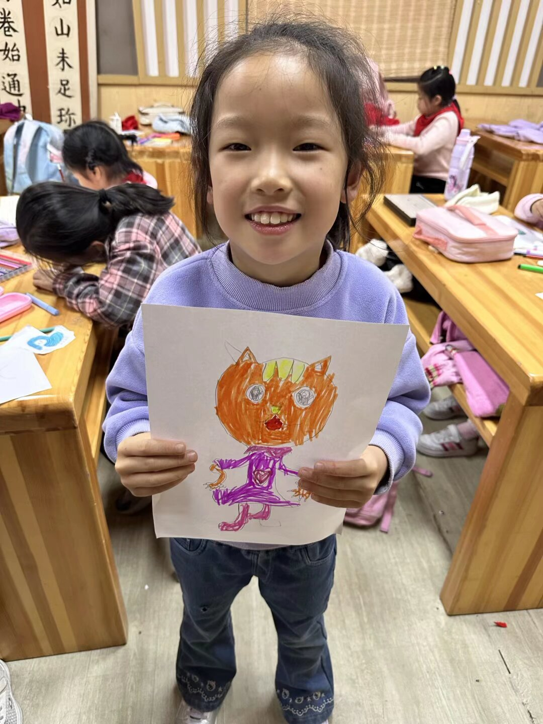 这堂“手绘小猫”课上,志愿者先引导孩子们回忆生活里猫咪的神态,再鼓励大家用自己的笔触还原“调皮感”。孩子握着笔,先描出圆弧形的猫身,再用细线条勾出微微翘起的尾巴,笔尖停顿几秒后,又给小猫添上了圆溜溜的眼睛——简单的线条里,藏着她对小猫模样的专属理解。