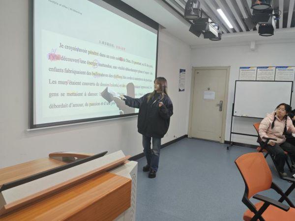 徐瀚月同学则以《法语专四核心词汇》等书籍为基础,提出借助数字化资源巩固语言功底,鼓励同学们积极参与交流活动及演讲、法语朗诵等赛事,在实践中提升法语水平。