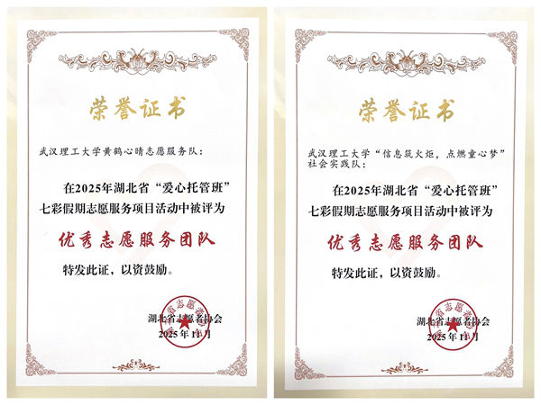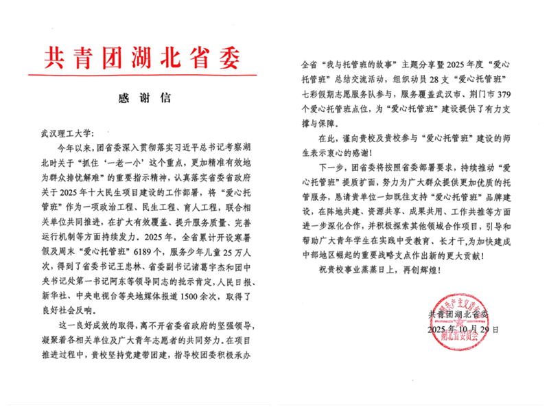 近日,共青团湖北省委向我校发来感谢信,对学校在全省“爱心托管班”项目建设中以党建带团建为引领的全力投入、突出成效给予高度评价,向学校及参与师生致以诚挚谢意,并勉励学校持续深化“爱心托管班”品牌建设,拓展阵地共建、资源共享等多领域合作,在实践育人中引导广大青年学生成长成才,为区域发展贡献更大力量。作为共青团中央“七彩假期”重点联系高校(全国仅10所),我校在项目推进过程中积极承办全省“我与托管班的故事”主题分享暨年度总结交流活动,组建28支志愿服务队深度参与实践,最终7支团队获评省级优秀项目团队,以青春之力践行志愿服务精神,用实际成效彰显了高校服务社会的责任与担当。